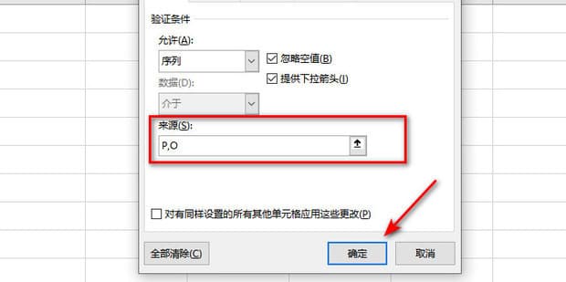 7:在来源的框内输入大写的P和O,然后点击确定。