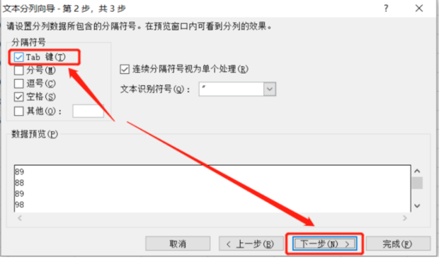 5、此时进入到【文本分列向导】的第2步,在分隔符号下的选择中保持默认的选项,单击【下一步】按钮。