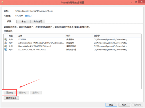 9:将hosts的权限项目界面下基本权限的所以项目都勾选上,然后点击确定。