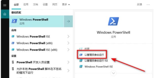 2:搜索框输入“Windows Powershell”,右键并点击【以管理员身份运行】。